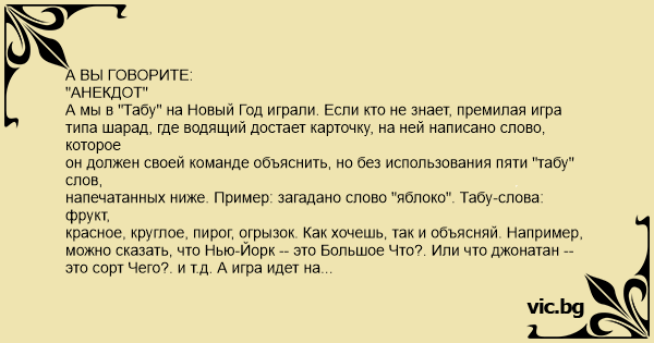 Итак, играли в "Табу" под Новый Год. Играли долго и упорно, с переходящим