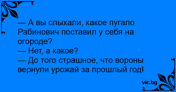 — А вы слыхали, какое пугало Рабинович поставил у себя на огоpоде?