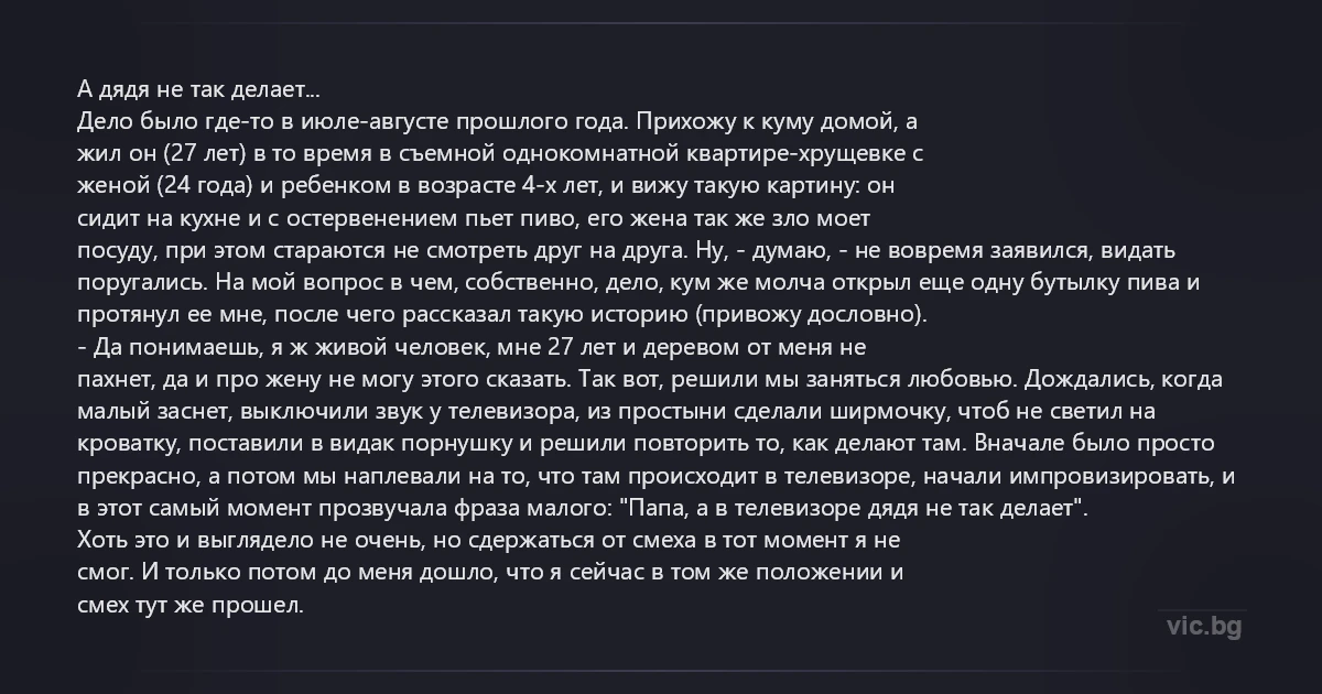 А дядя не так делает... Дело было где-то в июле-августе прошлого года. Прихожу к куму домой, а жил он (27 лет) в то время в съемной однокомнатной квартире-хрущевке с женой (24 года) и ребенком в возрасте 4-х лет, и вижу такую картину: он сидит на кухне и с остервенением пьет пиво, его жена так же зло моет посуду, при этом стараются не смотреть друг на друга. Ну, - думаю, - не вовремя заявился, видать поругались. На мой вопрос в чем, собственно, дело, кум же молча открыл еще одну бутылку пива и протянул ее мне, после чего рассказал такую историю (привожу дословно). - Да понимаешь, я ж живой человек, мне 27 лет и деревом от меня не пахнет, да и про жену не могу этого сказать. Так вот, решили мы заняться любовью. Дождались, когда малый заснет, выключили звук у телевизора, из простыни сделали ширмочку, чтоб не светил на кроватку, поставили в видак порнушку и решили повторить то, как делают там. Вначале было просто прекрасно, а потом мы наплевали на то, что там происходит в телевизоре, начали импровизировать, и в этот самый момент прозвучала фраза малого: "Папа, а в телевизоре дядя не так делает". Хоть это и выглядело не очень, но сдержаться от смеха в тот момент я не смог. И только потом до меня дошло, что я сейчас в том же положении и смех тут же прошел.