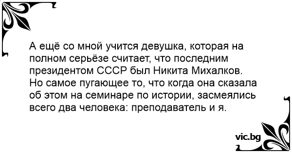 А ещё со мной учится девушка, которая на полном серьёзе считает, что последним президентом СССР был Никита Михалков.
