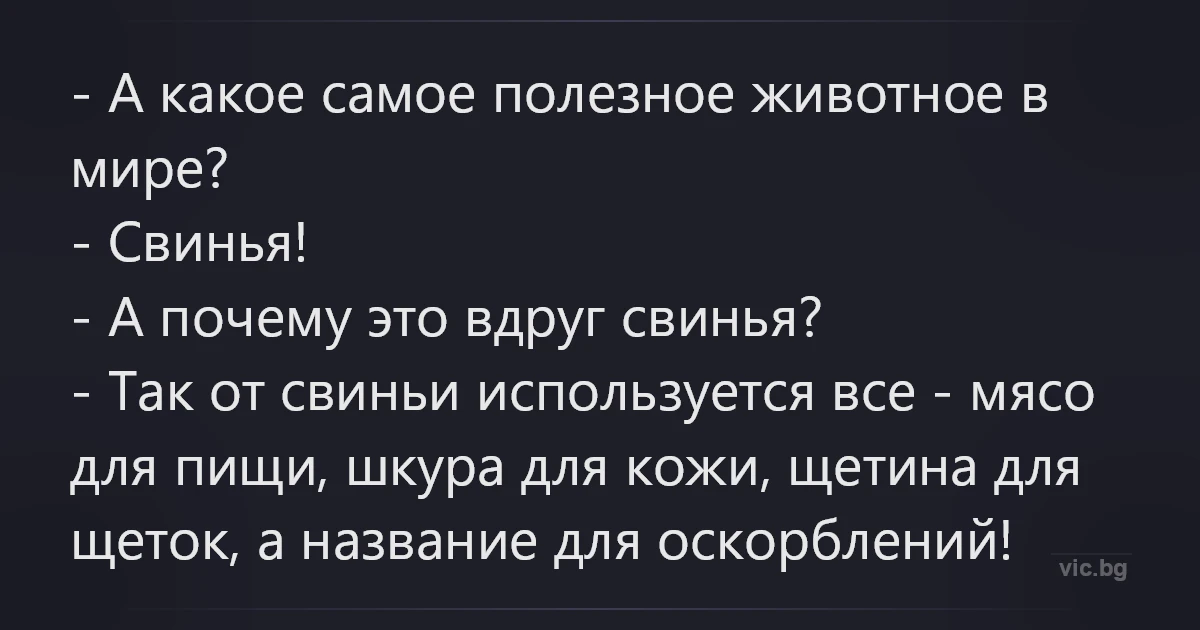 - А какое самое полезное животное в мире?<br />- Свинья!<br />- А почему это вдруг свинья?<br />- Так от свиньи используется все - мясо для пищи, шкура для кожи, щетина для щеток, а название для оскорблений!