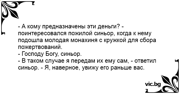 - А кому предназначены эти деньги? - поинтересовался пожилой синьор, когда к нему подошла молодая монахиня с кружкой для сбора пожертвований.