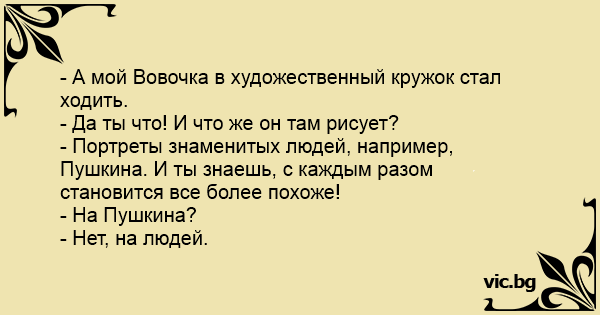 - А мой Вовочка в художественный кружок стал ходить.