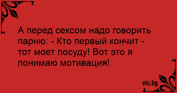 А перед сексом надо говорить парню: - Кто первый кончит - тот моет посуду! Вот это я понимаю мотивация!