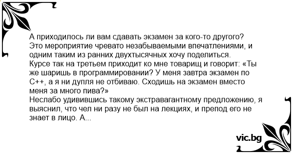 А приходилось ли вам сдавать экзамен за кого-то другого? Это мероприятие чревато незабываемыми впечатлениями, и одним таким из ранних двухтысячных хочу поделиться. Курсе так на третьем приходит ко мне товарищ и говорит: «Ты же шаришь в программировании? У меня завтра экзамен по С++, а я ни дупля не отбиваю. Сходишь на экзамен вместо меня за много пива?» Неслабо удивившись такому экстравагантному предложению, я выяснил, что чел ни разу не был на лекциях, и препод его не знает в лицо. А также любопытный факт: наши зачетки скомпонованы гениально. Фотка на обложке, а имя фамилия – на первой странице. Достаточно заменить обложку на свою, - и вуаля: появился новый студент. В свете этого согласился выручить друга. На следующий день, за 15 минут наваяв на листочке решение, приготовился к долгому ожиданию. Эх, где те времена, когда мы писали программки на бумаге… Прошло полчаса, я порешал задачки соседям, но все еще рано, идти первым сдавать некомильфо. А на экзамен отведено полтора часа. От скуки начеркал в своем решении, симулируя ошибки. Еще через 10 минут не выдержал, и пошел к преподавателю. Первым. Тот обрадовался, ему тоже скучно: «Молодец, неплохо написали, на четверку. Здесь три ошибки, идите подумайте, может, пятерку заработаете.» Ужаснувшись такой перспективе, я пробормотал: «Не-не, мне четверки достаточно!» Расстроенно хмыкнув, он поставил вожделенную оценку. Но отпускать не спешил, ибо еще долго скучать. - Вы откуда? – спрашивает. - Из Черкасской области, - я смутно помнил, как товарищ рассказывал о похождениях в своем поселке. - А из какого города? – и я понял, что попал. Кроме Черкасс, никаких городов там не знаю. Думаю, очень подозрительно побледнел тогда. Но в экстремальных ситуациях организм способен на чудеса. - Из Смелы, - радостно вспомнилось где-то виденное название. - И как дела у вашего завода? - (Мысленно) мля, там еще и завод есть? Терять уже нечего, остается выехать на общеизвестных фактах. И преподавателю: «Торугуют». Теперь пришло время ему удивляться. - Как торгуют? - Ну, время такое. Сейчас все торгуют… Посмотрев долгим взглядом, препод великодушно отпустил. Позже выяснилось, что завод там производит кассовые аппараты, и никак не может прогореть во время капитализма. А на следующий год товарищу предложили участвовать в олимпиаде по программированию, он потом на меня обижался почему-то. Я думаю, что преподаватель все понял и так пошутил.