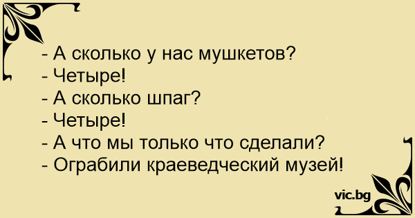 - А сколько у нас мушкетов? - Четыре! - А сколько шпаг? - Четыре! - А что мы только что сделали? - Ограбили краеведческий музей!