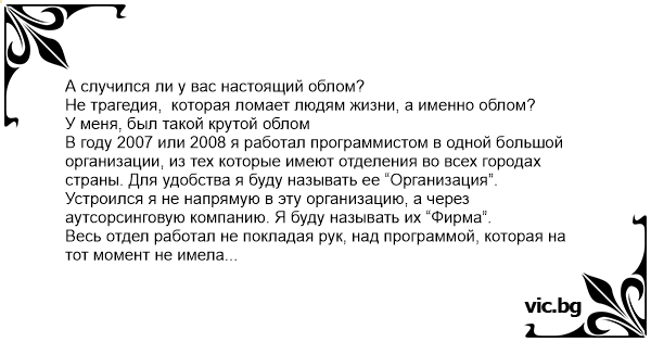 В году 2007 или 2008 я работал программистом в одной большой организации, из тех которые имеют отделения во всех городах страны. Для удобства я буду называть ее “Организация”.