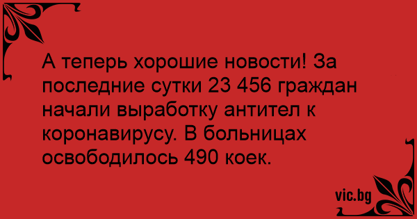 А теперь хорошие новости! За последние сутки 23 456 граждан начали выработку антител к коронавирусу. В больницах освободилось 490 коек.