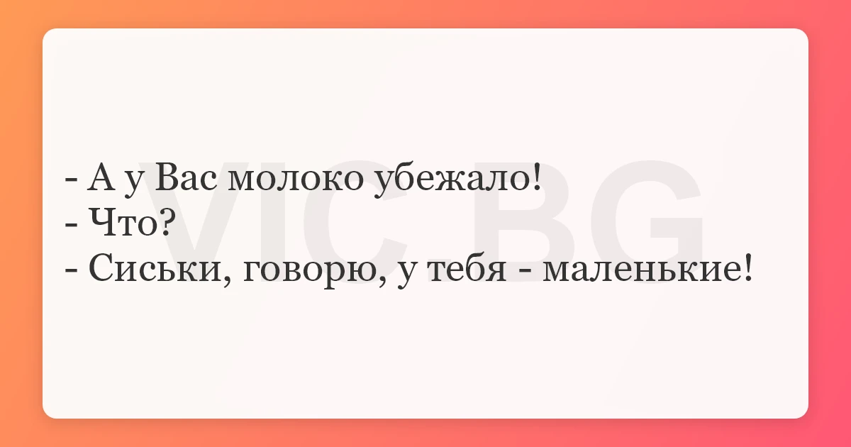 - А у Вас молоко убежало! - Что? - Сиськи, говорю, у тебя - маленькие!