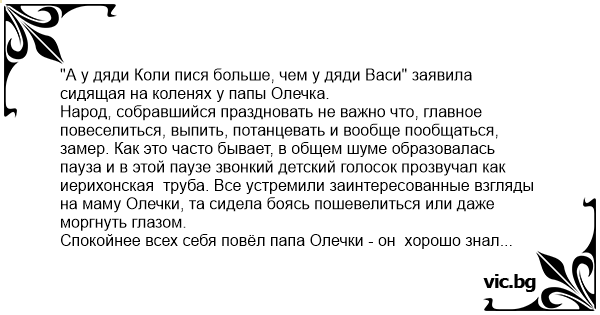 "А у дяди Коли пися больше, чем у дяди Васи" заявила сидящая на коленях у папы Олечка.