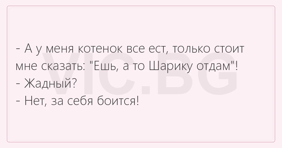 - А у меня котенок все ест, только стоит мне сказать: "Ешь, а то Шарику отдам"!