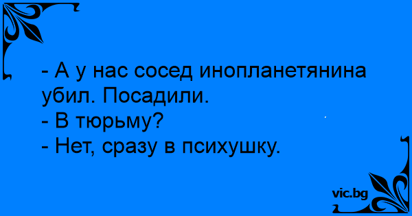 - А у нас сосед инопланетянина убил. Посадили.