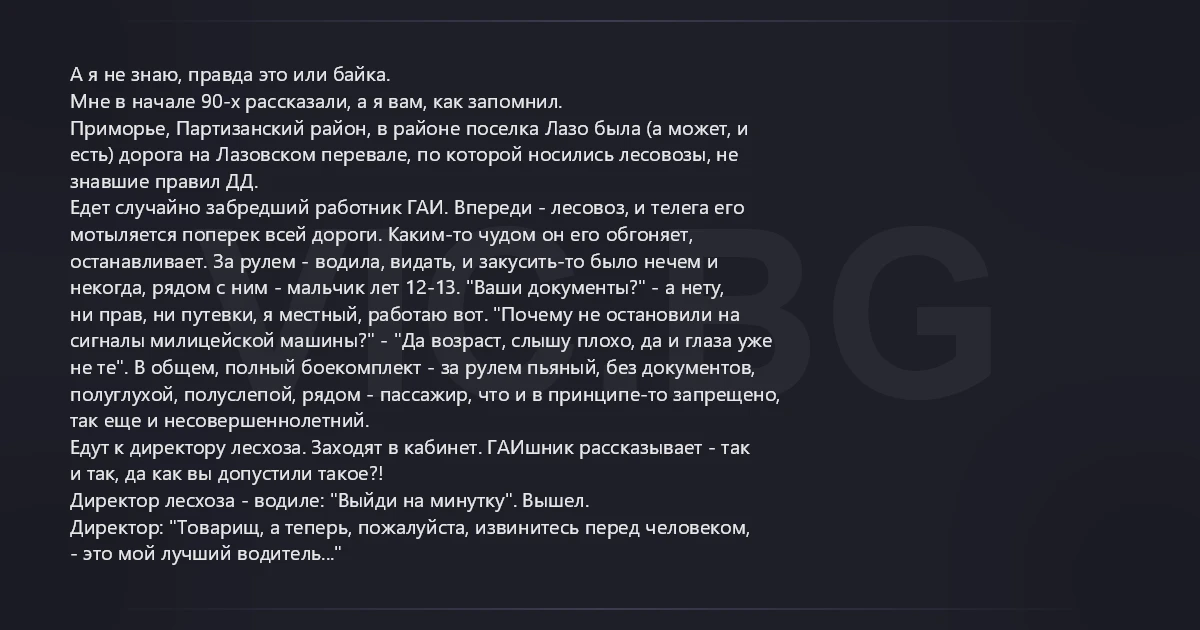 А я не знаю, правда это или байка. Мне в начале 90-х рассказали, а я вам, как запомнил. Приморье, Партизанский район, в районе поселка Лазо была (а может, и есть) дорога на Лазовском перевале, по которой носились лесовозы, не знавшие правил ДД. Едет случайно забредший работник ГАИ. Впереди - лесовоз, и телега его мотыляется поперек всей дороги. Каким-то чудом он его обгоняет, останавливает. За рулем - водила, видать, и закусить-то было нечем и некогда, рядом с ним - мальчик лет 12-13. "Ваши документы?" - а нету, ни прав, ни путевки, я местный, работаю вот. "Почему не остановили на сигналы милицейской машины?" - "Да возраст, слышу плохо, да и глаза уже не те". В общем, полный боекомплект - за рулем пьяный, без документов, полуглухой, полуслепой, рядом - пассажир, что и в принципе-то запрещено, так еще и несовершеннолетний. Едут к директору лесхоза. Заходят в кабинет. ГАИшник рассказывает - так и так, да как вы допустили такое?! Директор лесхоза - водиле: "Выйди на минутку". Вышел. Директор: "Товарищ, а теперь, пожалуйста, извинитесь перед человеком, - это мой лучший водитель..."