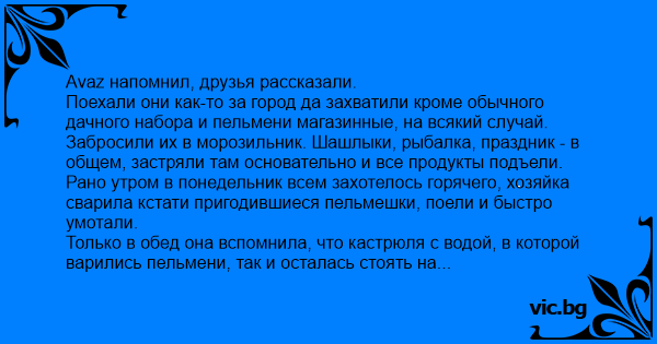 Поехали они как-то за город да захватили кроме обычного дачного набора и пельмени магазинные, на всякий случай.