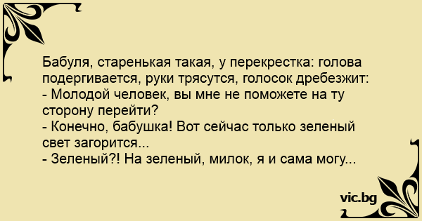 Стара баба чака на кръстовище. Прегърбена с бастун, с треперещи ръце и крака, тя казала на младежа до нея: