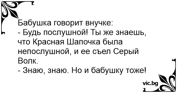 - Будь послушной! Ты же знаешь, что Красная Шапочка была непослушной, и ее съел Серый Волк.