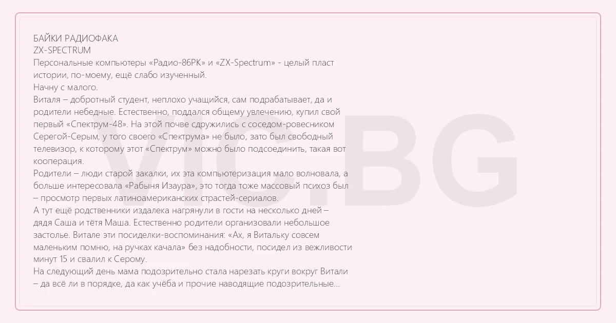 БАЙКИ РАДИОФАКА ZX-SPECTRUM Персональные компьютеры «Радио-86РК» и «ZX-Spectrum» - целый пласт истории, по-моему, ещё слабо изученный. Начну с малого. Виталя – добротный студент, неплохо учащийся, сам подрабатывает, да и родители небедные. Естественно, поддался общему увлечению, купил свой первый «Спектрум-48». На этой почве сдружились с соседом-ровесником Серегой-Серым, у того своего «Спектрума» не было, зато был свободный телевизор, к которому этот «Спектрум» можно было подсоединить, такая вот кооперация. Родители – люди старой закалки, их эта компьютеризация мало волновала, а больше интересовала «Рабыня Изаура», это тогда тоже массовый психоз был – просмотр первых латиноамериканских страстей-сериалов. А тут ещё родственники издалека нагрянули в гости на несколько дней – дядя Саша и тётя Маша. Естественно родители организовали небольшое застолье. Витале эти посиделки-воспоминания: «Ах, я Витальку совсем маленьким помню, на ручках качала» без надобности, посидел из вежливости минут 15 и свалил к Серому. На следующий день мама подозрительно стала нарезать круги вокруг Витали – да всё ли в порядке, да как учёба и прочие наводящие подозрительные вопросы. Отец и родственники прятали глаза, спросить младшего братца Андрюшу не было возможности – тот был у бабушки. В итоге после контрвопросов Витали выяснилось: гулеванившие предки решили устроить себе музыкальное сопровождение, в принципе, Виталя всегда позволял родителям брать кассеты из своей комнаты. Ну, и как можно догадаться, среди кассет с надписями «ABBA», «Dschinghis Khan», «Scorpions» и «Boney M» затесалась и кассета с надписью «Spectrum». Кто помнит, игрушки и прочие программы «Спектрум» закачивал именно с аудиокассет, не было тогда ещё ни дисководов, ни винчестеров, своей памяти хватало только на загрузку встроенного Бейсика. Звук эти кассеты издавали ужасный – от трелей сказочных птиц до страшных завываний. Вот эту кассету и поставили в магнитофон ничего не подозревавшие родители. Естественно, выслушав несколько секунд эту какофонию и помотав на всякий случай кассету туда-сюда, бедным родителям было отчего приуныть – перестроечная пресса так смаковала всякие молодёжные ужастики - от панков и рокеров до токсикоманов и наци, ну, значит, и сын поддался тлетворному влиянию и вот уже слушает сатанинскую музыку. Пришлось Витале проводить предкам компьютерный ликбез и вести их к Серому – демонстрировать игрушки и немного элементы программирования, чтоб, значит, показать, что Спектрум и в учёбе о-го-го как нужен. Что в итоге этой истории? Со слов Витали, плюсов два: родители лучше познакомились с соседями–родителями Серёги и привезли с дачи телевизор, специально для «Спектрума». А из минусов: - в семье ввели термин «компьютерное время» - папа и мама допускаются порезвиться в игрушки в строго отведённое время, причём, вот дедовщина! в свободное от просмотра «Рабыни Изауры», - в ближайшее время пользователей-нахлебников наверняка станет больше – младшему братцу Андрюше разрешат играть на компе, ежели он закончит четверть без троек, - никакой личной жизни, коли весь вечер в комнате проходной двор. Выводы: как можно быстрее перетащить «Спектрум» и телевизор в комнату к братцу, пусть он мучается, а самому копить на более мощный «Спектрум-Пентагон-128», чёрт с ними джинсами и новым магнитофоном!, и опять перебир