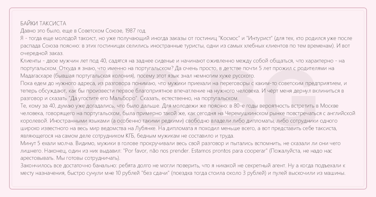 БАЙКИ ТАКСИСТА Давно это было, еще в Советском Союзе, 1987 год. Я - тогда еще молодой таксист, но уже получающий иногда заказы от гостиниц "Космос" и "Интурист" (для тех, кто родился уже после распада Союза поясню: в этих гостиницах селились иностранные туристы, одни из самых хлебных клиентов по тем временам). И вот очередной заказ. Клиенты - двое мужчин лет под 40, садятся на заднее сиденье и начинают оживленно между собой общаться, что характерно - на португальском. Откуда я знаю, что именно на португальском? Да очень просто, в детстве почти 5 лет прожил с родителями на Мадагаскаре (бывшая португальская колония), посему этот язык знал немногим хуже русского. Пока едем до нужного адреса, из разговора понимаю, что мужики приехали на переговоры с каким-то советским предприятием, и теперь обсуждают, как бы произвести первое благоприятное впечатление на нужного человека. И чёрт меня дернул вклиниться в разговор и сказать "Да угостите его Мальборо". Сказать, естественно, на португальском. Те, кому за 40, думаю уже догадались, что было дальше. Для молодежи же поясню: в 80-е годы вероятность встретить в Москве человека, говорящего на португальском, была примерно такой же, как сегодня на Черемушкинском рынке повстречаться с английской королевой. Иностранными языками (а особенно такими редкими) свободно владели либо дипломаты, либо сотрудники одного широко известного на весь мир ведомства на Лубянке. На дипломата я походил меньше всего, а вот представить себе таксиста, являющегося на самом деле сотрудником КГБ, бедным мужикам не составило и труда. Минут 5 ехали молча. Видимо, мужики в голове прокручивали весь свой разговор и пытались вспомнить, не сказали ли они чего лишнего. Наконец, один из них выдавил: "Por favor, não nos prender. Estamos prontos para cooperar" (Пожалуйста, не надо нас арестовывать. Мы готовы сотрудничать). Закончилось все достаточно банально: ребята долго не могли поверить, что я никакой не секретный агент. Ну а когда подъехали к месту назначения, быстро сунули мне 10 рублей "без сдачи" (поездка тогда стоила около 3 рублей) и пулей выскочили из машины.