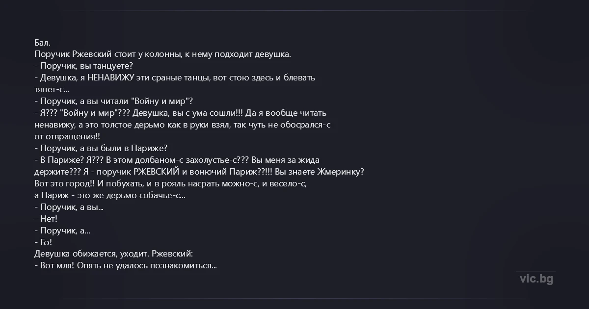 Бал. Поручик Ржевский стоит у колонны, к нему подходит девушка. - Поручик, вы танцуете? - Девушка, я НЕНАВИЖУ эти сраные танцы, вот стою здесь и блевать тянет-с... - Поручик, а вы читали "Войну и мир"? - Я??? "Войну и мир"??? Девушка, вы с ума сошли!!! Да я вообще читать ненавижу, а это толстое дepьmo как в руки взял, так чуть не обосрался-с от отвращения!! - Поручик, а вы были в Париже? - В Париже? Я??? В этом долбаном-с захолустье-с??? Вы меня за жида держите??? Я - поручик РЖЕВСКИЙ и вонючий Париж??!!! Вы знаете Жмеринку? Вот это город!! И побухать, и в рояль насрать можно-с, и весело-с, а Париж - это же дepьmo собачье-с... - Поручик, а вы... - Нет! - Поручик, а... - Бэ! Девушка обижается, уходит. Ржевский: - Вот мля! Опять не удалось познакомиться...