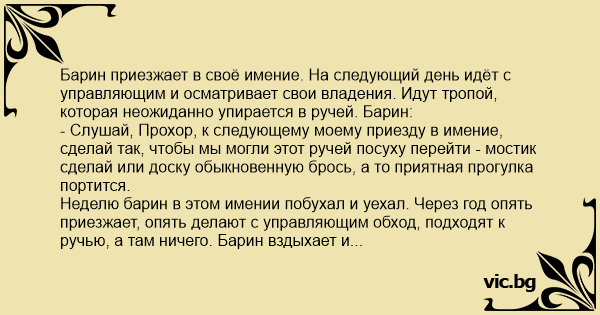 Неделю барин в этом имении побухал и уехал. Через год опять приезжает, опять делают с управляющим обход, подходят к ручью, а там ничего. Барин вздыхает и молча заезжает управляющему в ухо. Тот падает, барин молча уходит. На следующий день барин пошел на охоту, подходит к ручью в болотных сапогах, а там мост расписной. Подзывает управляющего:
