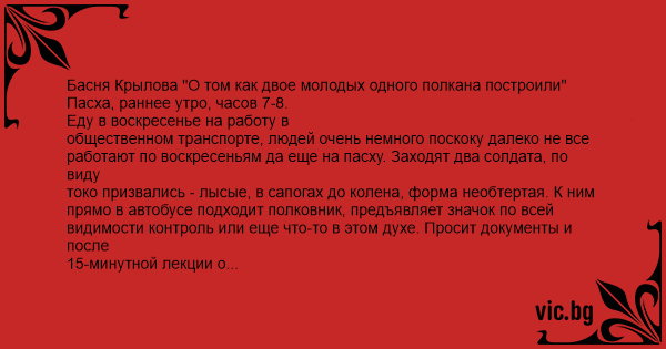 Басня Крылова "О том как двое молодых одного полкана построили" Пасха, раннее утро, часов 7-8.