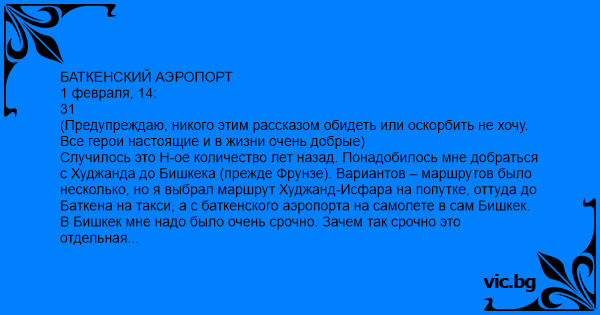 БАТКЕНСКИЙ АЭРОПОРТ 1 февраля, 14: 31 (Предупреждаю, никого этим рассказом обидеть или оскорбить не хочу. Все герои настоящие и в жизни очень добрые) Случилось это Н-ое количество лет назад. Понадобилось мне добраться с Худжанда до Бишкека (прежде Фрунзе). Вариантов – маршрутов было несколько, но я выбрал маршрут Худжанд-Исфара на попутке, оттуда до Баткена на такси, а с баткенского аэропорта на самолете в сам Бишкек. В Бишкек мне надо было очень срочно. Зачем так срочно это отдельная история. Итак, сам Баткен. Маленький городок. Пыльные дороги с разбитым асфальтом, по которым встречаются вьюченные ослики. Таксист притормозил у маленького, ветхого одноэтажного здания больше походившего сельпо (как потом мне объяснили, раньше это было здание детского сада). Я сидел. Ну, мало ли остановился, может - сломалось что-то в машине, а может – задумался просто. У сельских людей ведь понятие времени иное. У них два времени: «до обеда» и «после обеда», а все остальное им не нужно. Это городским важно знать, на сколько часов и сколько минут они куда-то опаздывают. - Вот. Аэропорт, - повернулся ко мне водитель с улыбкой. Я не поверил и, не выходя с машины, стал с окна разглядывать здание. Появилась идея, что меня хотят кинуть. Потом я заметил некие атрибуты летной площадки, красно полосатый флюгер и надпись АЭРОПОРТ. Это реально был настоящий аэропорт. Я расплатился, вышел с машины и медленно пошел в сторону аэропорта. Ни забора, ни охраны. Летной площадки вообще не было видно. Я тихо открыл скрипучую дверь и вошел в помещение. Простое пустое помещение в двадцать квадратных метров. У противоположной стены окошка кассира. Я неуверенно подошел к окошку и так же неуверенно, даже не поздоровавшись, спросил: - Здесь билеты в Бишкек продают? За стеклом сидел мужчина в вязаном свитере и пиджаке поверх него, и вписывал что-то в огромный журнал. Он посмотрел на меня сверх очков и кивнул. - Билет на самолет? – спросил я, показывая ладонью вверх, как пионеры давали салют, потому что ждал что тут максимум могут продавать билеты на автобус. - Да, - утвердительно кивнул. - Аааа можно мне тогда один билет в Бишкек? – спросил я, чувствуя себя так, как будто участвую в розыгрыше, и вот выбегут смеющиеся люди со словами «вас снимала скрытая камера!». - Нет, - коротко ответил мужчина вязаном в свитере. - А почему? - спросил я. - Билетов нет! Я подумал. В Бишкек надо было очень срочно. Поэтому я решил попробовать еще раз. - А можно как-то решить этот вопрос? - спросил я. - Подождите. Отвечал он как настоящий советский чиновник бюрократ, любимой фразой которого, была «ждите…» Простояв минут десять, я снова подошел к окошку, показывая всем видом, как я сильно жду. Когда терпеть было уже, не было сил, я спросил: - А, простите, долго ждать? - Сейчас начальник придет, - кивнул головой мужчина в вязаном свитере, указывая на стенку, - он решит. Причем, кивая, он показал, насколько важен этот начальник. Я посмотрел в сторону, куда он кивнул и заметил дверь с надписью «Начальник». Действительно. Тут даже начальник свой есть. Ну что ж. Начальник так начальник. Простоял еще минут двадцать. Снова подхожу к окошку. - А во сколько он обычно приходит, начальник-то? Мужчина в свитере посмотрел на часы и ответил: - Сейчас подойдет. Начальник у нас не опаздывает. Я поневоле немного даже удивился. Какой важный и ответственный начальн