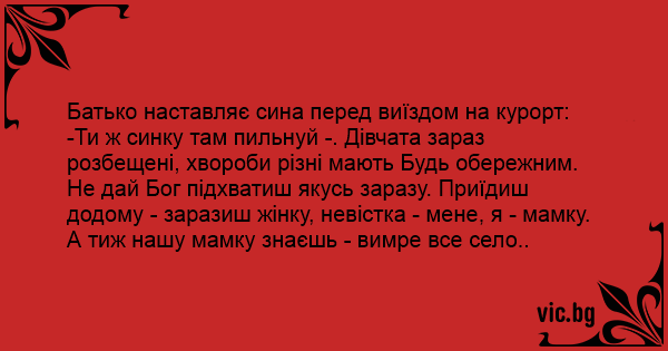 -Ти ж синку там пильнуй -. Дівчата зараз розбещені, хвороби різні мають Будь обережним. Не дай Бог підхватиш якусь заразу. Приїдиш додому - заразиш жінку, невістка - мене, я - мамку. А тиж нашу мамку знаєшь - вимре все село..