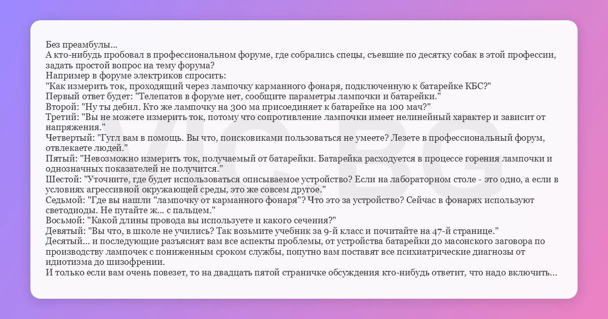 Без преамбулы... А кто-нибудь пробовал в профессиональном форуме, где собрались спецы, съевшие по десятку собак в этой профессии, задать простой вопрос на тему форума? Например в форуме электриков спросить: "Как измерить ток, проходящий через лампочку карманного фонаря, подключенную к батарейке КБС?" Первый ответ будет: "Телепатов в форуме нет, сообщите параметры лампочки и батарейки." Второй: "Ну ты дeбил. Кто же лампочку на 300 ма присоединяет к батарейке на 100 мач?" Третий: "Вы не можете измерить ток, потому что сопротивление лампочки имеет нелинейный характер и зависит от напряжения." Четвертый: "Гугл вам в помощь. Вы что, поисковиками пользоваться не умеете? Лезете в профессиональный форум, отвлекаете людей." Пятый: "Невозможно измерить ток, получаемый от батарейки. Батарейка расходуется в процессе горения лампочки и однозначных показателей не получится." Шестой: "Уточните, где будет использоваться описываемое устройство? Если на лабораторном столе - это одно, а если в условиях агрессивной окружающей среды, это же совсем другое." Седьмой: "Где вы нашли "лампочку от карманного фонаря"? Что это за устройство? Сейчас в фонарях используют светодиоды. Не путайте ж... с пальцем." Восьмой: "Какой длины провода вы используете и какого сечения?" Девятый: "Вы что, в школе не учились? Так возьмите учебник за 9-й класс и почитайте на 47-й странице." Десятый... и последующие разъяснят вам все аспекты проблемы, от устройства батарейки до масонского заговора по производству лампочек с пониженным сроком службы, попутно вам поставят все психиатрические диагнозы от идиотизма до шизофрении. И только если вам очень повезет, то на двадцать пятой страничке обсуждения кто-нибудь ответит, что надо включить амперметр в разрыв одного провода между батарейкой и лампочкой.