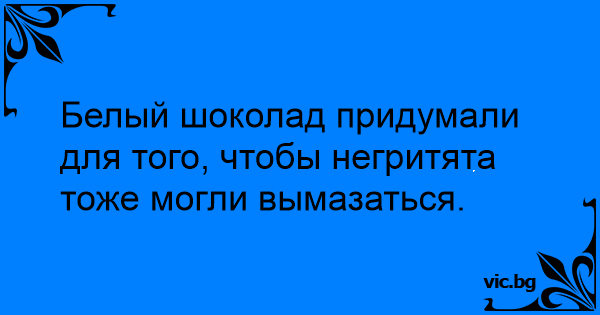 Γιατί οι αράπηδες τρώνε μόνο άσπρες σοκολάτες; Σοκολάτα Γιατί βγήκαν οι άσπρες σοκολάτες; Знаете ли защо негрите ядат само бял шоколад? Οι σοκολάτες - Знаете ли защо са измислили белия шоколад? - Защо е измислен белия шоколад? - Зачем придумали белый шоколад? - Чтобы и негритятам было чем выпачкать свои мордашки! Varför uppfann man vit choklad? – För att negrarna inte ska bita sig i fingrarna när de äter choklad. Q: Why did they invent white chocolate? A: So all black kids could get their faces messy too. Why did the white chocolate was invented? So niggers can get dirty! Hvorfor har man opfundet hvid chokolade? – Så negere ikke skal bide sig selv i fingeren – Varför säljs så mycket vit choklad i Afrika? – För att de inte skall bita sig i fingrarna. Warum hat ein Neger im Kino, wenn er Schokolade ißt, weiße Handschuhe an? Damit er sich nicht in die Finger beißt! Wieso wurde weiße Schokolade erfunden? – Damit Neger sich beim Essen nicht in die Finger beißen. – For at negerene ikke bider sig selv i fingrene når de spiser chokolade. Hvorfor har man opfundet hvid chokolade? De ce s-a inventat ciocolata alba? Pt a se murdari si copii negri la gura - Po co produkuje się białą czekoladę? - Żeby murzynek też mógł się upieprzyć.