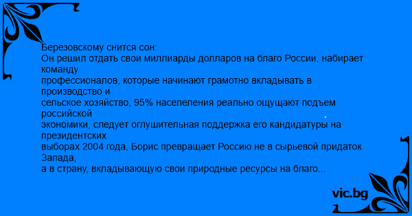 Березовскому снится сон: Он решил отдать свои миллиарды долларов на благо России, набирает команду профессионалов, которые начинают грамотно вкладывать в производство и сельское хозяйство, 95% населеления реально ощущают подъем российской экономики, следует оглушительная поддержка его кандидатуры на президентских выборах 2004 года, Борис превращает Россию не в сырьевой придаток Запада, а в страну, вкладывающую свои природные ресурсы на благо народа. 12 лет продолжается рост экономики, создается сверхмобильная и профессиональная армия, создана непревзойденная система обороны от любого агрессора. США, исчерпавшие свои природные запасы, переживают глубочайший кризис, их долг России составил 200 миллиардов долларов. Россия много лет выполняет роль международного полицейского и судьи, ни один значимый вопрос не решается без участия России. Построены полностью автоматизированные производства, экология в норме, ядерные отходы Россия хоронит теперь в Китае и США.... БАБ просыпается в холодном поту: - Бля, приснится же ХEPHЯ всякая.....