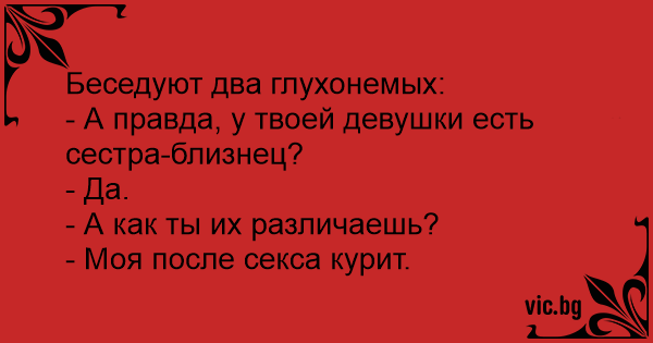 Двама глухонеми: Цветко го прашува Трпе: - Трпе, ти се ожени со близначка, како ги разликуваш? - Многу лесно, жена ми после секс пуши цигара, а балдазата пие.