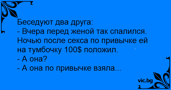 - Вчера перед женой так спалился. Ночью после cekca по привычке ей на тумбочку 100$ положил.