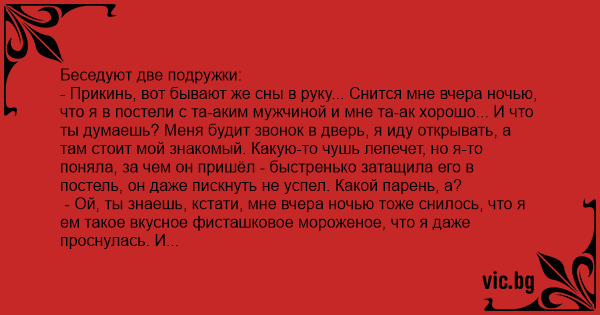 Беседуют две подружки: - Прикинь, вот бывают же сны в руку... Снится мне вчера ночью, что я в постели с та-аким мужчиной и мне та-ак хорошо... И что ты думаешь? Меня будит звонок в дверь, я иду открывать, а там стоит мой знакомый. Какую-то чушь лепечет, но я-то поняла, за чем он пришёл - быстренько затащила его в постель, он даже пискнуть не успел. Какой парень, а? - Ой, ты знаешь, кстати, мне вчера ночью тоже снилось, что я ем такое вкусное фисташковое мороженое, что я даже проснулась. И так мне его захотелось, что я разбудила Витька и попросила его сходить и купить мне такого мороженого. И что ты думаешь? Он ни слова не сказал, встал, оделся и пошёл искать мороженое посреди ночи. Вернулся только под утро. Мороженого, правда, так и нашёл, но какой парень заботливый, а? - Ага, вот я и говорю... Открываю дверь, а там Витёк стоит и фисташковое мороженое просит...