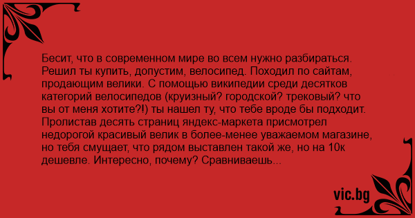Ты решаешь, что велосипед тебе не очень-то и нужен. Он внушает тебе страх бесчисленным числом деталей, о которых ты знаешь слишком мало и не можешь полностью доверять сохранность своего здоровья. Вдруг откажут тормоза, которые были собраны на заводе, где двое китайских рабочих недавно покончили с собой, но в новостях об этом, естественно, не писали. Или седло попало в магазин из конфискованной на границе партии, где проверяющий орган смутился зашкаливающим счетчиком Гейгера? Или, например, прямо сейчас на каком-то неведомом тебе форуме пользователи обсуждают, не связана ли оригинальная модель рамы некоего велосипеда с развившейся у топикстартера межпозвоночной грыжей? Деталей так много, что среди них может запросто скрываться та, что причинит вред твоему здоровью, и именно тебе повезет стать одним из тысяч покупателей, кто с ней столкнется.
