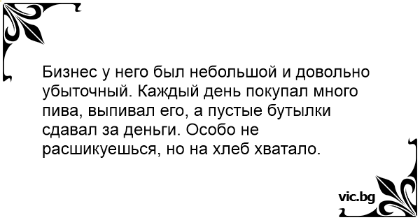 Бизнес у него был небольшой и довольно убыточный. Каждый день покупал много пива, выпивал его, а пустые бутылки сдавал за деньги. Особо не расшикуешься, но на хлеб хватало.