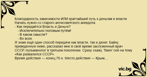 Благодарность зависимости ИЛИ кратчайший путь к деньгам и власти Начать нужно со старого антисоветского анекдота:
