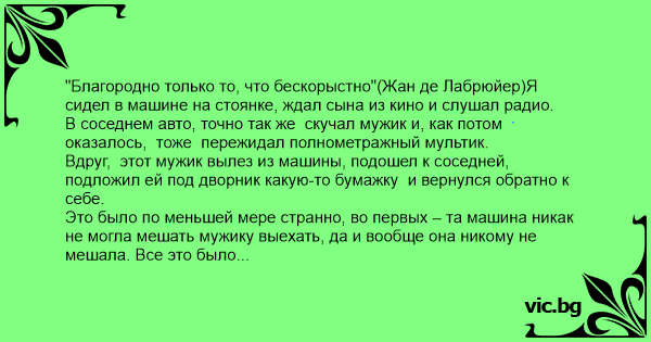 "Благородно только то, что бескорыстно"(Жан де Лабрюйер)Я сидел в машине на стоянке, ждал сына из кино и слушал радио.