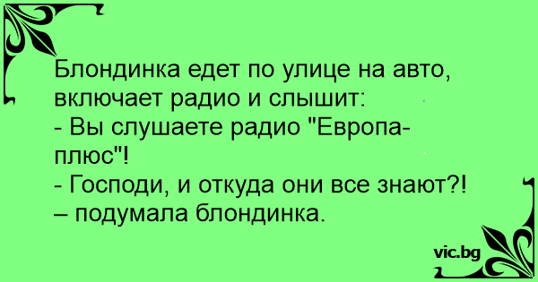 Блондинка їде по вулиці на авто, включає радіо і чує: — Ви слухаєте радіо "Європа-плюс"! — Господи, і звідки вони все про мене знають?! — подумала блондинка.
