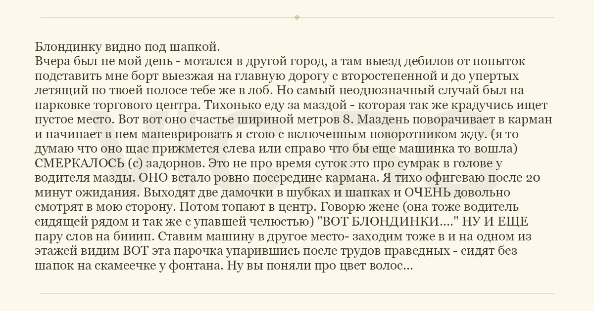 Вчера был не мой день - мотался в другой город, а там выезд дебилов от попыток подставить мне борт выезжая на главную дорогу с второстепенной и до упертых летящий по твоей полосе тебе же в лоб. Но самый неоднозначный случай был на парковке торгового центра. Тихонько еду за маздой - которая так же крадучись ищет пустое место. Вот вот оно счастье шириной метров 8. Маздень поворачивает в карман и начинает в нем маневрировать я стою с включенным поворотником жду. (я то думаю что оно щас прижмется слева или справо что бы еще машинка то вошла) СМЕРКАЛОСЬ (с) задорнов. Это не про время суток это про сумрак в голове у водителя мазды. ОНО встало ровно посередине кармана. Я тихо офигеваю после 20 минут ожидания. Выходят две дамочки в шубках и шапках и ОЧЕНЬ довольно смотрят в мою сторону. Потом топают в центр. Говорю жене (она тоже водитель сидящей рядом и так же с упавшей челюстью) "ВОТ БЛОНДИНКИ...." НУ И ЕЩЕ пару слов на бииип. Ставим машину в другое место- заходим тоже в и на одном из этажей видим ВОТ эта парочка упарившись после трудов праведных - сидят без шапок на скамеечке у фонтана. Ну вы поняли про цвет волос...