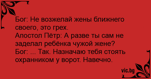 Бог: ... Так. Назначаю тебя стоять охранником у ворот. Навечно.