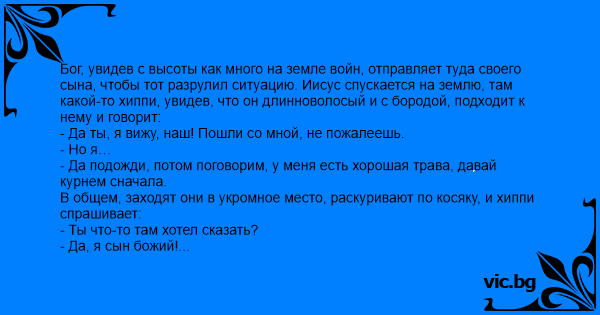 Бог, увидев с высоты как много на земле войн, отправляет туда своего сына, чтобы тот разрулил ситуацию. Иисус спускается на землю, там какой-то хиппи, увидев, что он длинноволосый и с бородой, подходит к нему и говорит: