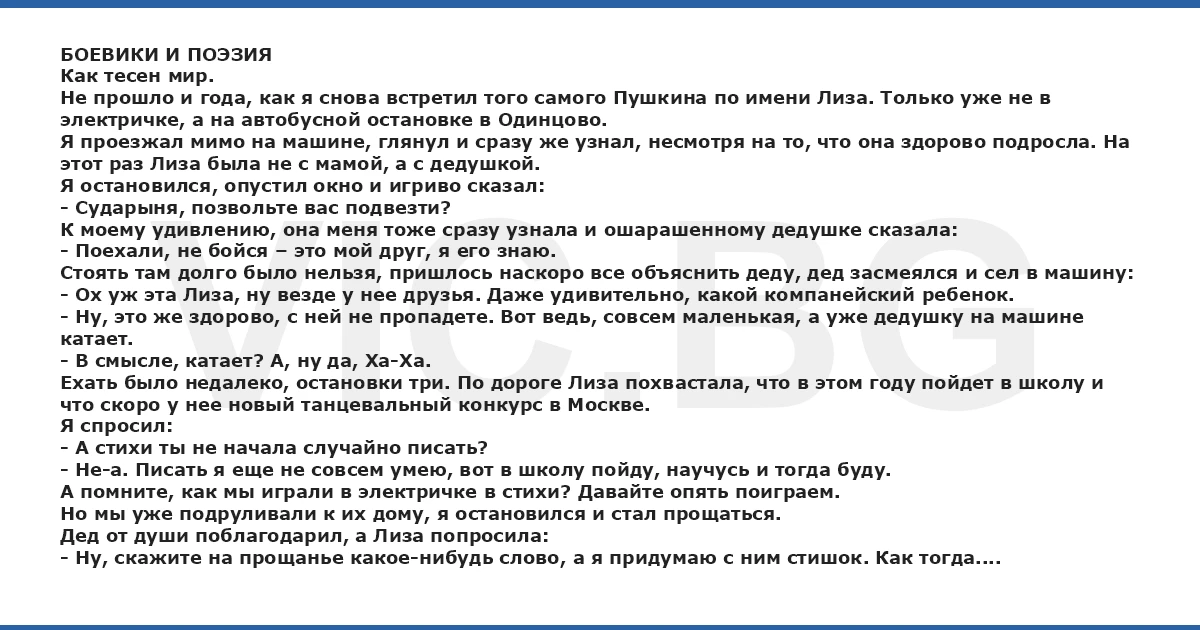 БОЕВИКИ И ПОЭЗИЯ Как тесен мир. Не прошло и года, как я снова встретил того самого Пушкина по имени Лиза. Только уже не в электричке, а на автобусной остановке в Одинцово. Я проезжал мимо на машине, глянул и сразу же узнал, несмотря на то, что она здорово подросла. На этот раз Лиза была не с мамой, а с дедушкой. Я остановился, опустил окно и игриво сказал: - Сударыня, позвольте вас подвезти? К моему удивлению, она меня тоже сразу узнала и ошарашенному дедушке сказала: - Поехали, не бойся – это мой друг, я его знаю. Стоять там долго было нельзя, пришлось наскоро все объяснить деду, дед засмеялся и сел в машину: - Ох уж эта Лиза, ну везде у нее друзья. Даже удивительно, какой компанейский ребенок. - Ну, это же здорово, с ней не пропадете. Вот ведь, совсем маленькая, а уже дедушку на машине катает. - В смысле, катает? А, ну да, Ха-Ха. Ехать было недалеко, остановки три. По дороге Лиза похвастала, что в этом году пойдет в школу и что скоро у нее новый танцевальный конкурс в Москве. Я спросил: - А стихи ты не начала случайно писать? - Не-а. Писать я еще не совсем умею, вот в школу пойду, научусь и тогда буду. А помните, как мы играли в электричке в стихи? Давайте опять поиграем. Но мы уже подруливали к их дому, я остановился и стал прощаться. Дед от души поблагодарил, а Лиза попросила: - Ну, скажите на прощанье какое-нибудь слово, а я придумаю с ним стишок. Как тогда. Я задумался, что бы такое задать позаковыристей, включил радио и оттуда сказали: «…были уничтожены два боевика.» - А, вот тебе и фраза: Были уничтожены два боевика. Лиза нахмурилась и спросила: - А это хорошо, или плохо? - Ну, боевики ведь плохие люди – это бандиты, значить очень хорошо, раз они были уничтожены. Лиза кивнула, улыбнулась и радостно, с выражением прочитала: - Были уничтожены два боевика. Ур-а-а! - кричало небо, бабы и река...