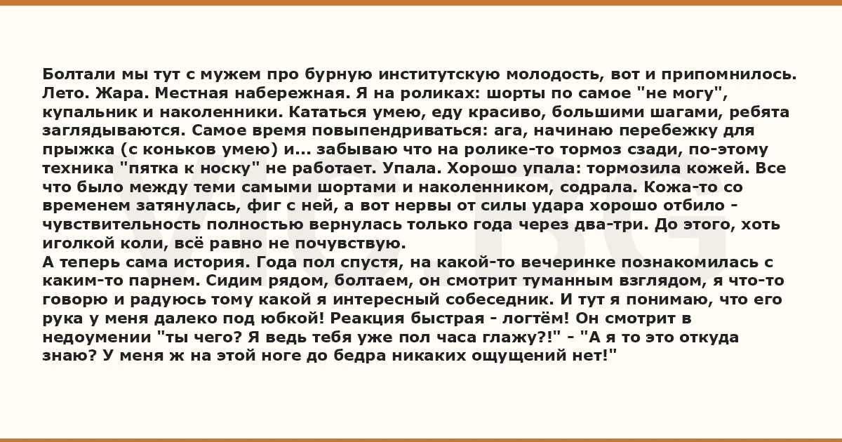 Болтали мы тут с мужем про бурную институтскую молодость, вот и припомнилось. Лето. Жара. Местная набережная. Я на роликах: шорты по самое "не могу", купальник и наколенники. Кататься умею, еду красиво, большими шагами, ребята заглядываются. Самое время повыпендpиваться: ага, начинаю перебежку для прыжка (с коньков умею) и... забываю что на ролике-то тормоз сзади, по-этому техника "пятка к носку" не работает. Упала. Хорошо упала: тормозила кожей. Все что было между теми самыми шортами и наколенником, содрала. Кожа-то со временем затянулась, фиг с ней, а вот нервы от силы удара хорошо отбило - чувствительность полностью вернулась только года через два-три. До этого, хоть иголкой коли, всё равно не почувствую. А теперь сама история. Года пол спустя, на какой-то вечеринке познакомилась с каким-то парнем. Сидим рядом, болтаем, он смотрит туманным взглядом, я что-то говорю и радуюсь тому какой я интересный собеседник. И тут я понимаю, что его рука у меня далеко под юбкой! Реакция быстрая - логтём! Он смотрит в недоумении "ты чего? Я ведь тебя уже пол часа глажу?!" - "А я то это откуда знаю? У меня ж на этой ноге до бедра никаких ощущений нет!"