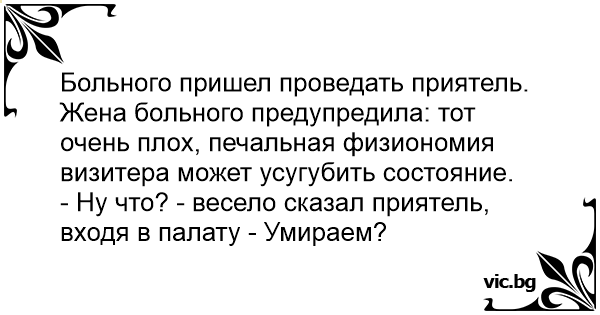 Больного пришел проведать приятель. Жена больного предупредила: тот очень плох, печальная физиономия визитера может усугубить состояние.