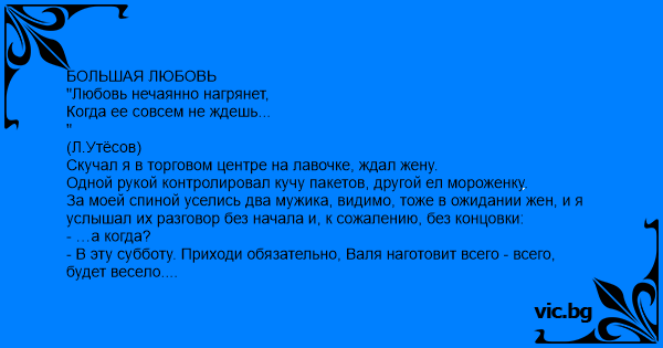 БОЛЬШАЯ ЛЮБОВЬ "Любовь нечаянно нагрянет, Когда ее совсем не ждешь... " (Л.Утёсов) Скучал я в торговом центре на лавочке, ждал жену. Одной рукой контролировал кучу пакетов, другой ел мороженку. За моей спиной уселись два мужика, видимо, тоже в ожидании жен, и я услышал их разговор без начала и, к сожалению, без концовки: - …а когда? - В эту субботу. Приходи обязательно, Валя наготовит всего - всего, будет весело. - Андрюха, я не обещаю, но очень постараемся. А какая годовщина у вас? - О, дай подумать… шестнадцать, точно шестнадцать, или даже семнадцать. - Фигa се. Это срок. Получается у вас какая свадьба? Деревянная, там, или дээспэшная? - Да, хpeн ее знает, я не по этим делам. - Андрюха, а как вы с Валей вообще познакомились? О, а - это смешная история. Я не рассказывал? Слушай: Шел я с работы, смотрю, Валька плачет и что-то там с мобильным телефоном борется. Естественно, я тогда еще не знал, что она Валя, да и вообще, поначалу она мне как-то не особо... Никакой любви с первого взгляда, абсолютно. Но плачет же, дай думаю, спрошу - может помощь нужна?. Спросил. А она в тот самый момент навсегда поругалась со своим прежним козлом. Был там какой-то. Поругалась и в истерике немедленно пыталась убить его в своем телефоне, ну, у баб свои «заморочки». И у нее нифига не получалось. А тут я нарисовался со своей помощью, она и попросила меня, мол вы мужчина, должны лучше разбираться в технике. Я, конечно говорю: «Говно ваш вопрос, мадам, пара пустяков, сейчас все сделаем» взял в руки мобилу, а сам думаю: «Куда я лезу?» У меня ведь своего мобильника тогда еще не было, только мечтал. Я его и в руках-то до этого никогда не держал. Смотрю и так и сяк, а в меню действительно нет нигде пункта «удалить контакт». Все пересмотрел, нету. Валя стоит, ждет, нахваливает меня, что, мол, хорошо, когда мужчина в технике соображает. Даже плакать перестала. Назад дороги уже не было, не мог же я сказать, типа – хpeн его знает, спросите еще у кого-нибудь, кто лучше «шарит», а я всего лишь безтелефонный нищеброд. А время идет, я аж весь вспотел, но делаю вид, что так и надо - задача трудная, посложнее чем к Пентагону подключиться. Короче, никак не могу удалить, хоть убейся, но зато обнаружил пункт «редактировать», вот я и смекнул - вместо имени того козла написал «Андрей», а вместо его номера, вбил свой домашний, типа так и хотел. Отдаю телефон обратно, она довольная: «Спасибо огромное! Ну, что, получилось удалить?» Я говорю: «Конечно удалил, и следа не осталось, а заодно и свой телефон вам записал и имя. На всякий случай» Она глаза выпучила и как заорет: «А вы мне там нахрена нужны!? На какой такой случай!? Я же вас не просила ничего писать! Давай теперь, стирай!» Меня, конечно, "перемкнуло" от такой наглости, я послал ее подальше и добавил: «Ну, не нравится, тогда сама и стирай, овца тупая!» Развернулся и дальше пошел… …Тут, из соседнего магазина послышался женский голос: - Андрюша, пойдем посмотришь, я тебе кое-что нашла! Мужики за моей спиной послушно встали и навсегда унесли от меня концовку этой прелестной истории большой любви…