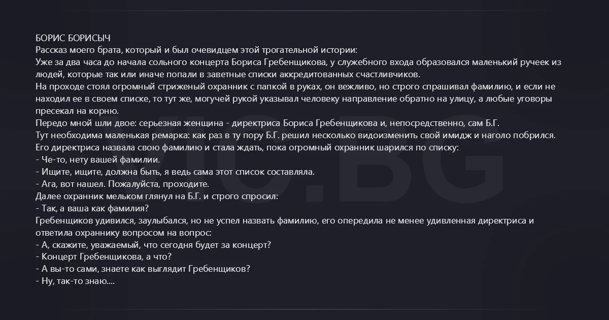БОРИС БОРИСЫЧ Рассказ моего брата, который и был очевидцем этой трогательной истории: Уже за два часа до начала сольного концерта Бориса Гребенщикова, у служебного входа образовался маленький ручеек из людей, которые так или иначе попали в заветные списки аккредитованных счастливчиков. На проходе стоял огромный стриженый охранник с папкой в руках, он вежливо, но строго спрашивал фамилию, и если не находил ее в своем списке, то тут же, могучей рукой указывал человеку направление обратно на улицу, а любые уговоры пресекал на корню. Передо мной шли двое: серьезная женщина - директриса Бориса Гребенщикова и, непосредственно, сам Б.Г. Тут необходима маленькая ремарка: как раз в ту пору Б.Г. решил несколько видоизменить свой имидж и наголо побрился. Его директриса назвала свою фамилию и стала ждать, пока огромный охранник шарился по списку: - Че-то, нету вашей фамилии. - Ищите, ищите, должна быть, я ведь сама этот список составляла. - Ага, вот нашел. Пожалуйста, проходите. Далее охранник мельком глянул на Б.Г. и строго спросил: - Так, а ваша как фамилия? Гребенщиков удивился, заулыбался, но не успел назвать фамилию, его опередила не менее удивленная директриса и ответила охраннику вопросом на вопрос: - А, скажите, уважаемый, что сегодня будет за концерт? - Концерт Гребенщикова, а что? - А вы-то сами, знаете как выглядит Гребенщиков? - Ну, так-то знаю. - А позвольте вас спросить, как же он выглядит? - Как? В смысле? Ну, обычно выглядит – очки, бородка, длинные волосы. А что? - Волосы длинные, говорите? - Ну, да... Директриса повернулась к улыбающемуся Б.Г., развела руками и грустно сказала: - Ну, что, довы...лись, Борис, Борисыч…?