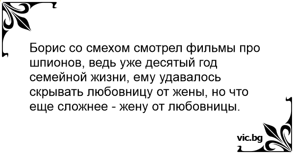 Борис со смехом смотрел фильмы про шпионов, ведь уже десятый год семейной жизни, ему удавалось скрывать любовницу от жены, но что еще сложнее - жену от любовницы.
