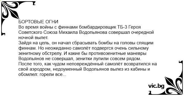 Во время войны с финнами бомбардировщик ТБ-3 Героя Советского Союза Михаила Водопьянова совершал очередной ночной вылет. Зайдя на цель, он начал сбрасывать бомбы на головы спящим финнам. Но неожиданно самолёт подвергся очень сильному зенитному обстрелу. И какие бы противозенитные маневры Водопьянов не совершал, зенитки лупили совсем рядом. После того, как чудом неповреждённый самолёт возвратился на свой аэродром, недоуменный Водопьянов вылез из кабины и обомлел: горели все бортовые огни. Оказалось, что он случайно включил их во время ночного полёта. Тогда он собрал экипаж и строго спросил у бортстрелков, почему те ему ничего не доложили об этом. Ответ был потрясающий: - Товарищ командир, мы думали, что вы специально включили бортовые огни, чтобы нам светлее было...
