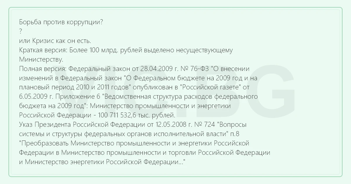 Борьба против коррупции? ? или Кризис как он есть. Краткая версия: Более 100 млрд. рублей выделено несуществующему Министерству. Полная версия: Федеральный закон от 28.04.2009 г. № 76-ФЗ "О внесении изменений в Федеральный закон "О Федеральном бюджете на 2009 год и на плановый период 2010 и 2011 годов" опубликован в "Российской газете" от 6.05.2009 г. Приложение 6 "Ведомственная структура расходов федерального бюджета на 2009 год": Министерство промышленности и энергетики Российской Федерации - 100 711 532,6 тыс. рублей. Указ Президента Российской Федерации от 12.05.2008 г. № 724 "Вопросы системы и структуры федеральных органов исполнительной власти" п.8 "Преобразовать Министерство промышленности и энергетики Российской Федерации в Министерство промышленности и торговли Российской Федерации и Министерство энергетики Российской Федерации..."