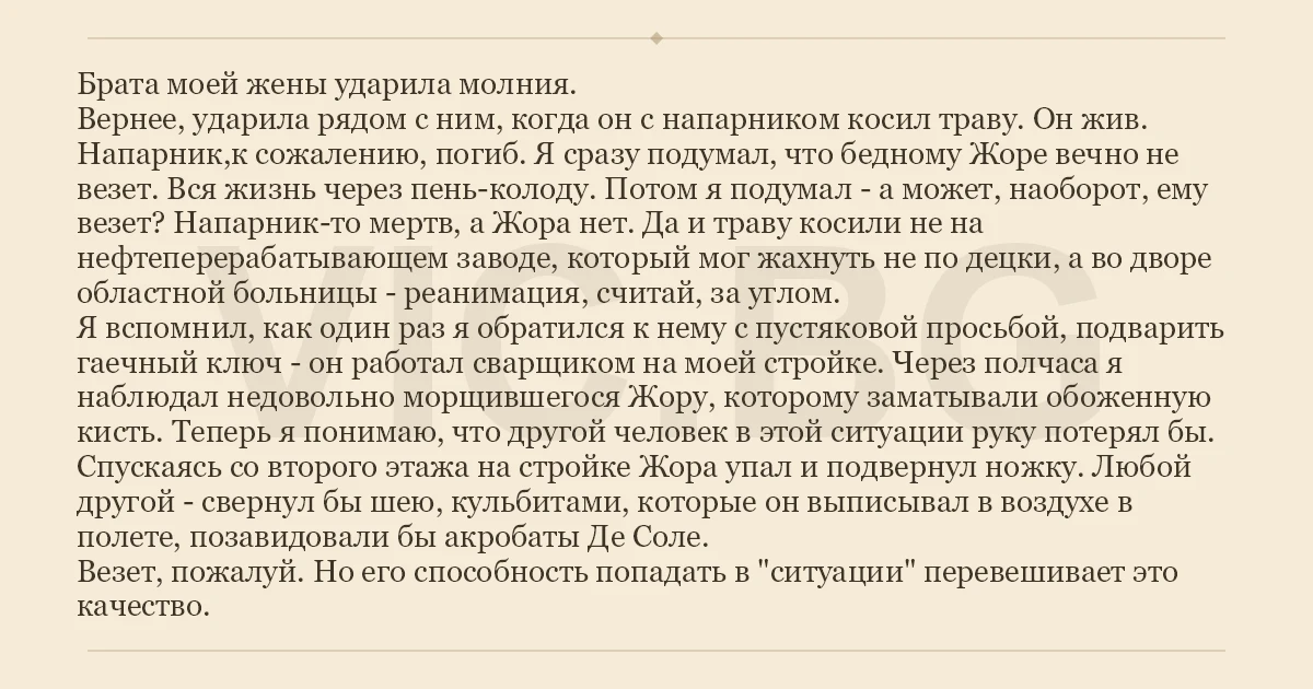 Брата моей жены ударила молния. Вернее, ударила рядом с ним, когда он с напарником косил траву. Он жив. Напарник,к сожалению, погиб. Я сразу подумал, что бедному Жоре вечно не везет. Вся жизнь через пень-колоду. Потом я подумал - а может, наоборот, ему везет? Напарник-то мертв, а Жора нет. Да и траву косили не на нефтеперерабатывающем заводе, который мог жахнуть не по децки, а во дворе областной больницы - реанимация, считай, за углом. Я вспомнил, как один раз я обратился к нему с пустяковой просьбой, подварить гаечный ключ - он работал сварщиком на моей стройке. Через полчаса я наблюдал недовольно морщившегося Жору, которому заматывали обоженную кисть. Теперь я понимаю, что другой человек в этой ситуации руку потерял бы. Спускаясь со второго этажа на стройке Жора упал и подвернул ножку. Любой другой - свернул бы шею, кульбитами, которые он выписывал в воздухе в полете, позавидовали бы акробаты Де Соле. Везет, пожалуй. Но его способность попадать в "ситуации" перевешивает это качество.